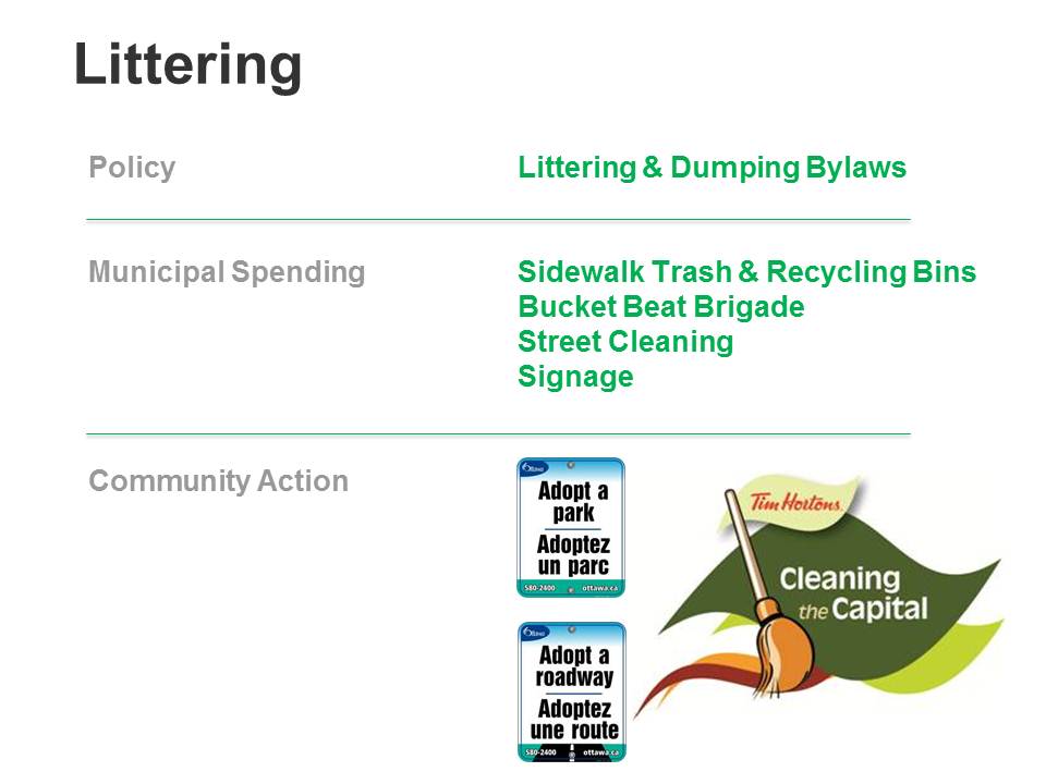 Policy: At the policy level, bylaws were created so that if an individual threw an apple core on the street or if a business dumped a case of apples in the ditch they would be fined. Businesses were left with the responsibility (and any associated costs) of managing the storage & collection of their own waste in accordance to the bylaws. At first many resisted but after a while many began to see the health, economic and environmental benefits of having a litter-free city.