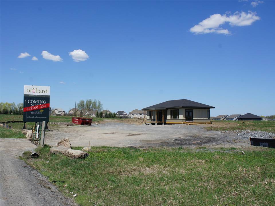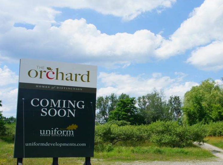 After picture: “The Orchard, Model Home Now Open”. In the background you can not
